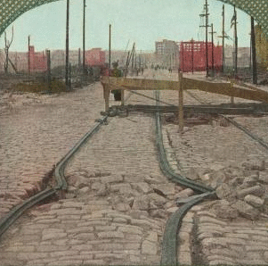 Mission Street car track and pavement showing the resistless power of earthquakes, April 18, 1906. 1906