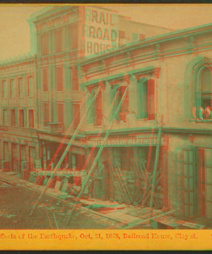 Effects of the Earthquake, Oct. 21, 1868, Railroad House, Clay St. 1868 1868-1906